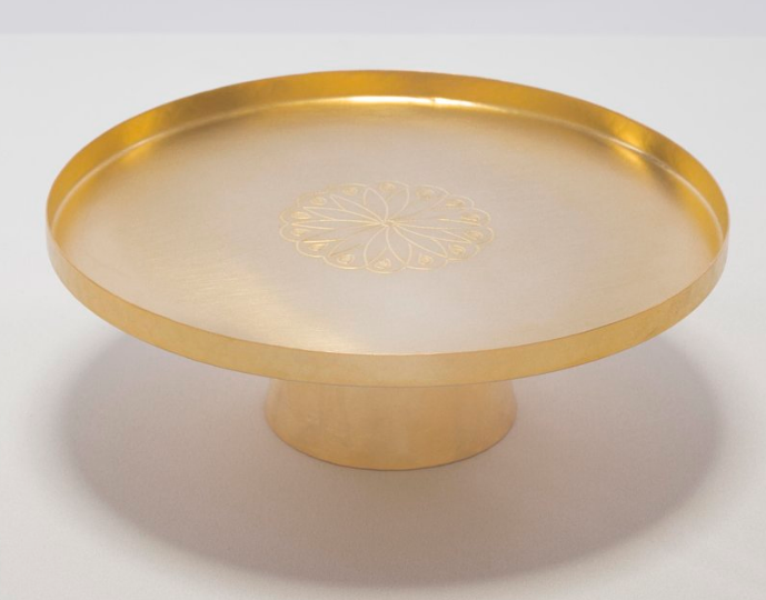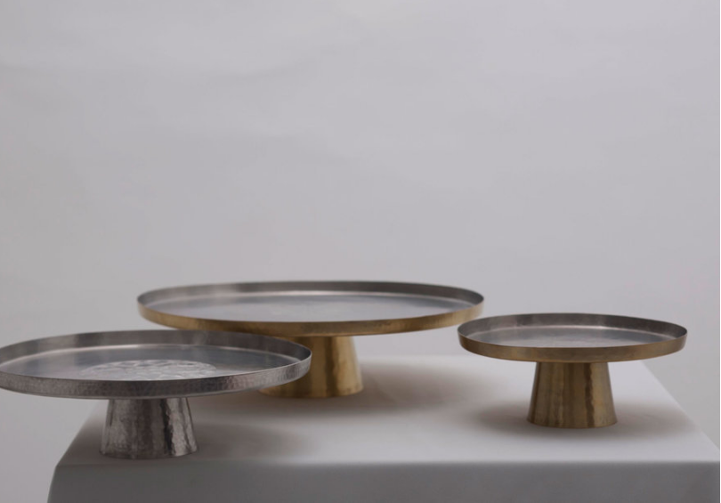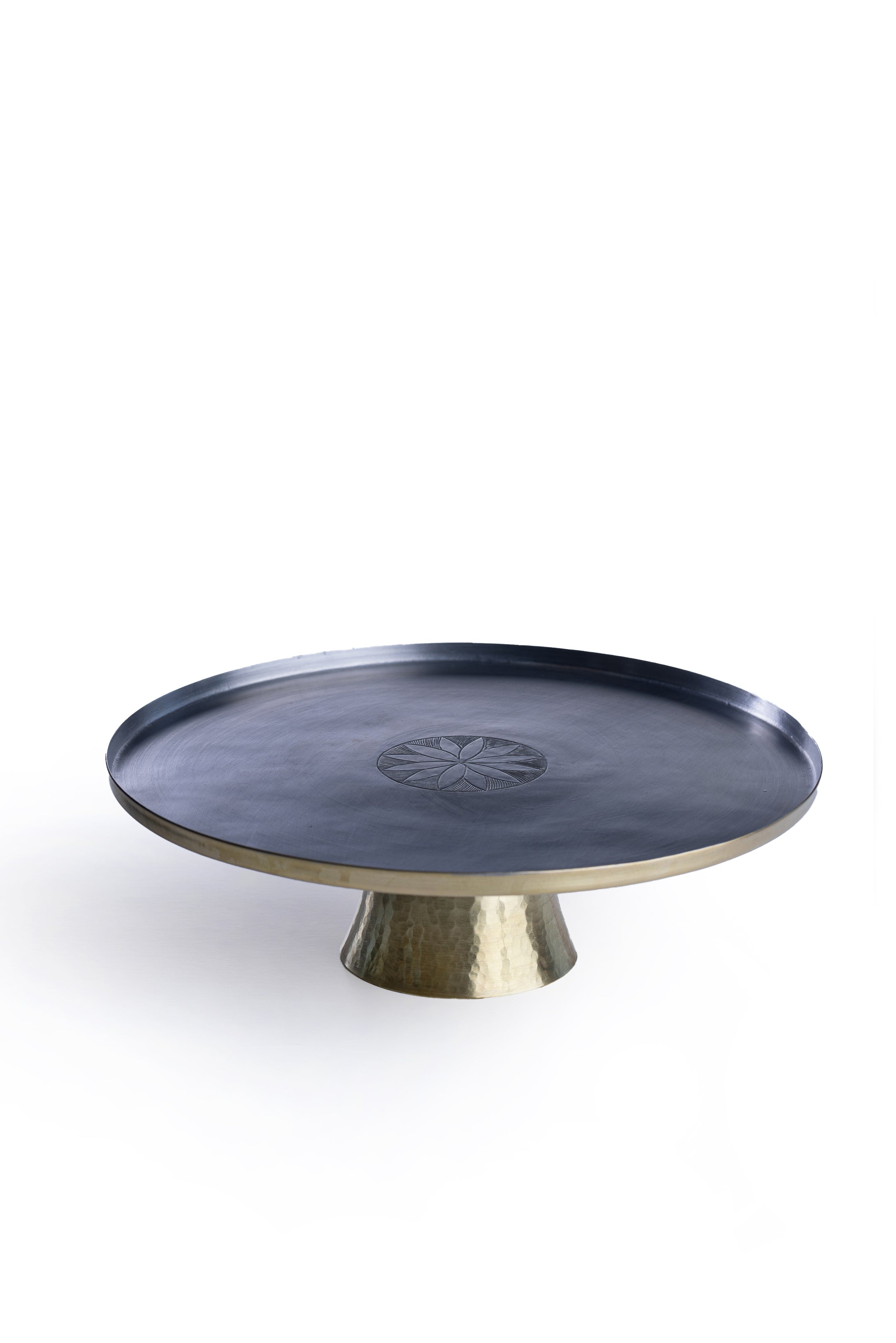 A slender tray balanced on top of a gently inclined cylindrical base, this generous cake stand comes decorated in a variety of hand-etched geometric patterns and graceful Arabesque. The small version can also be used in a conjunction with the large one to create a beautiful tiered stand.