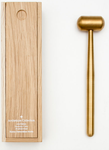An early iteration of the flint, the hammer has been around at least as long as Lascaux. As the gavel, the hammer was transformed from tool into icon of authority, used to deliver verdicts, call crowds to attention and seal deals in court rooms and auction houses the world over. By taking it out of the toolbox and giving it pride of place on the table, Outbid renews and reaffirms the value of this essential object.