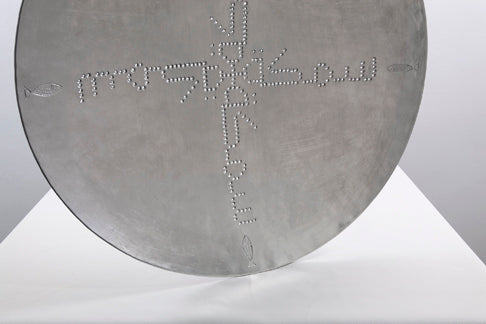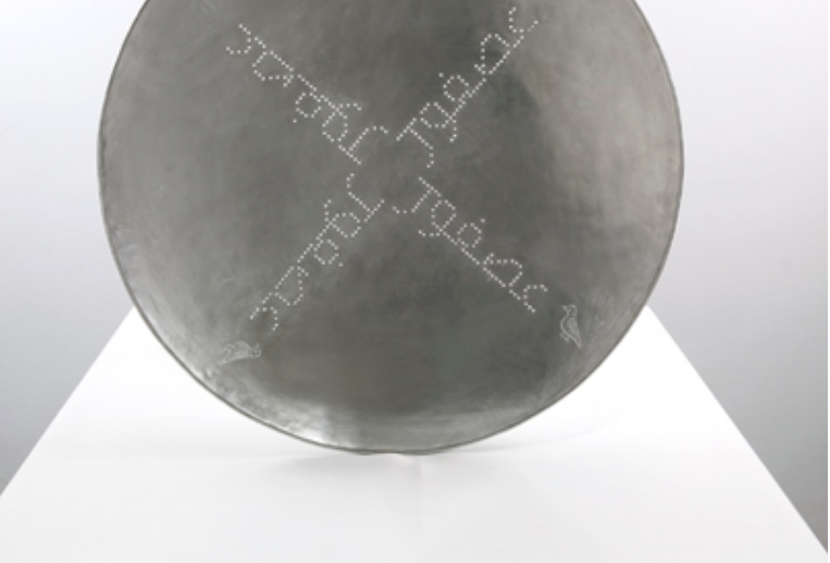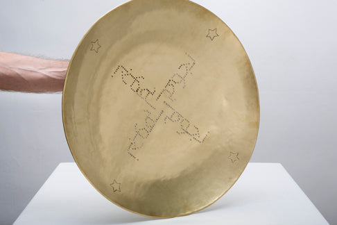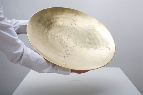 The mostly smooth surface is decorated with contemporary Arabic typography created in collaborations with graphic designer Raya Khalaf that is picked out in perforations and arranged around the center of dish. All three- Asfour/ Bird, Noujoum/ Star, Samkeh/ Fish- are symbols of good luck or good news.